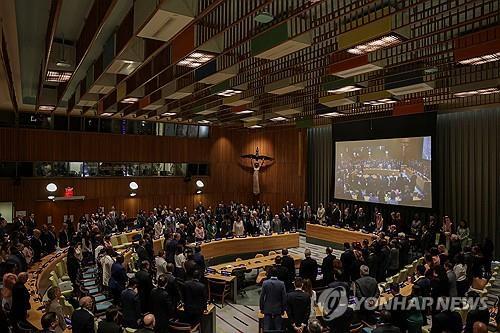 가자 전쟁 희생자 추모하는 유엔회의 참석자들 [뉴욕 로이터=연합뉴스. 재판매 및 DB 금지] |