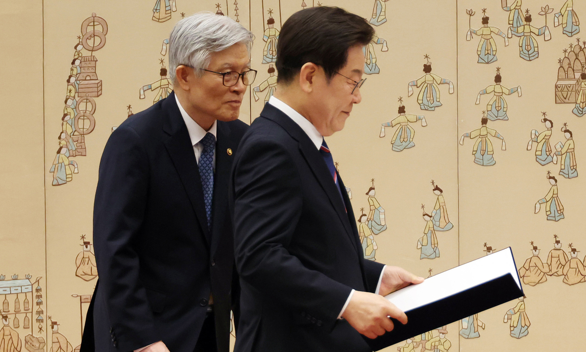 최동석 인사혁신처장이 28일 서울 용산 대통령실 청사에서 이재명 대통령의 신임 국무위원 및 국세청장 임명장 수여를 돕고 있다. 대통령실통신사진기자단 |