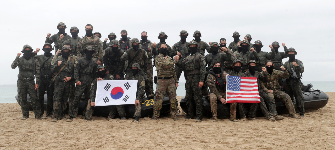 2023년 8월 28일 강원도 양양군 해상침투전술훈련장에서 ‘UFS/TIGER’ 일환 특전사 연합 해상침투 훈련이 진행된 가운데 육군특수전사령부, 주한미특수작전사령부 장병들이 훈련을 마친 뒤 기념촬영을 하고 있다. [헤럴드경제 DB] |