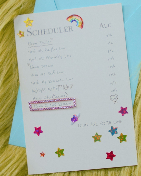 오늘(29일) 0시 레드벨벳 공식 SNS 계정에 게재된 조이 첫 번째 미니앨범 '프롬 조이, 위드 러브(From JOY, with Love)' 스케줄 포스터는 파스텔 컬러 봉투와 알록달록한 스티커 장식이 돋보이는 편지 콘셉트로, 청량하면서도 사랑스러운 분위기 속에 다채로운 티징 콘텐츠 일정이 담겨 있어 눈길을 끌었다.
