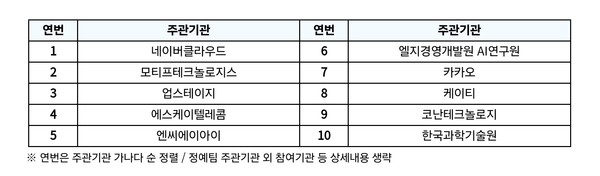 평가 결과 네이버클라우드 모티프테크놀로지스 업스테이지 SK텔레콤 엔씨AI LG경영개발원 AI연구원 카카오 KT 코난테크놀로지 한국과학기술연구원 등이 정예 팀에 선정됐다.