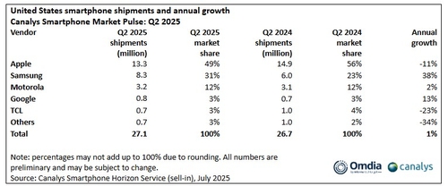 29일 시장조사업체 카날리스에 따르면 지난 2분기 주요 스마트폰 제조사의 미국 시장 점유율은 애플이 49%로 가장 높았고 삼성이 31%로 뒤를 이었다. 모토로라는 12%, 구글과 TCL은 각각 3%였으며 기타 제조사 합산 점유율은 3%로 나타났다.