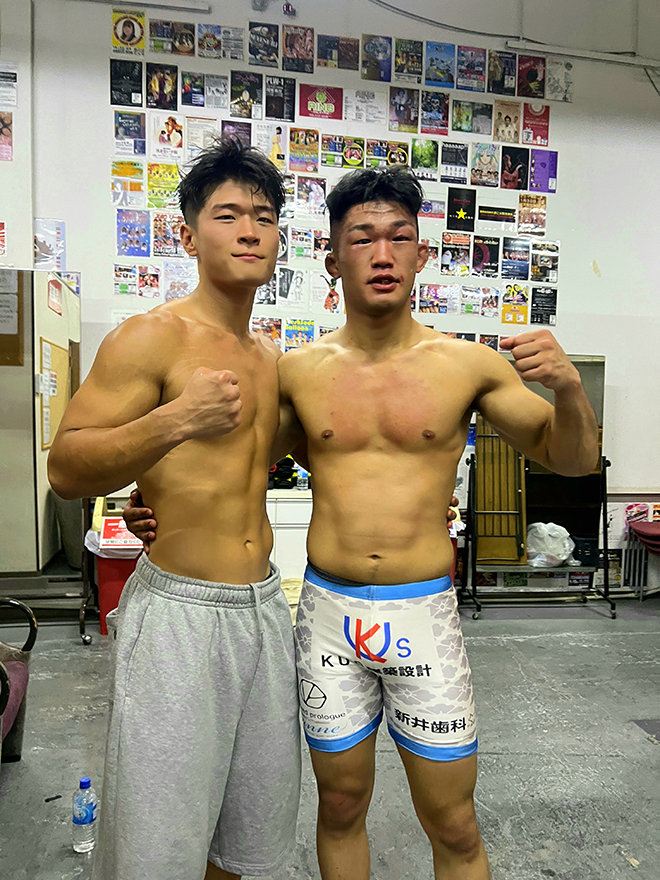 권지후가 2025년 7월 일본 오사카 벤텐초세카이칸 WARDOG 53 메인이벤트 승리 후 우에다 겐토와 기념 촬영을 하고 있다. 사진=스탠다드앤드프로그레스 스포츠에이전시 제공 |