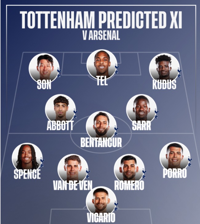 '토트넘 홋스퍼 뉴스'는 손흥민은 마티스 텔, 쿠두스와 공격진에서 호흡을 맞출 거라고 했다. 벤탄쿠르, 파페 마타르 사르 등이 중원에 이름을 올렸고 수비진엔 제드 스펜스, 미키 판 더 펜, 크리스티안 로메로, 페드로 포로가 위치했다. 골키퍼는 굴리엘모 비카리오였다.