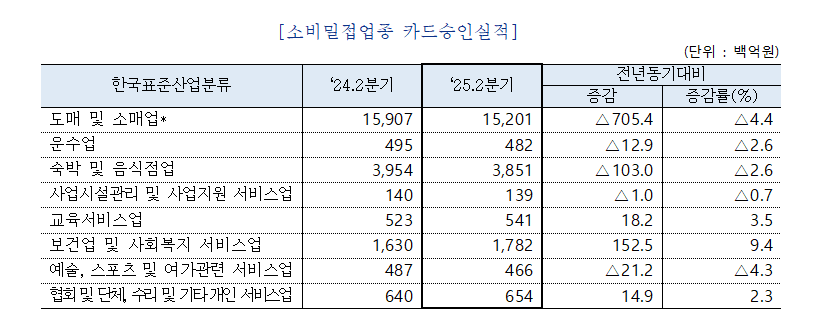 업종별로는 보건업 및 사회복지서비스업이 각급 병·의원 이용 증가로 가장 높은 증가율(9.4%)을 기록했다. 반면 항공여객 및 여행 관련 산업 지출 증가세가 완화하면서 운수업(-2.6%)과 숙박 및 음식점업(-2.6%)의 승인 실적은 줄었다.
