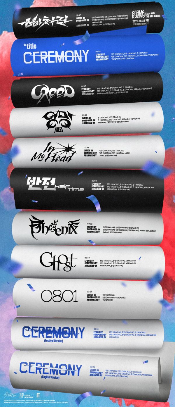 특히 이번에도 그룹 내 프로듀싱 팀 쓰리라차(3RACHA)가 타이틀곡 'CEREMONY'를 포함한 전곡 크레디트에 이름을 올려 눈길을 끈다. 직접 만든 음악으로 미국 빌보드 '빌보드 200' 6연속 1위 진입하며 차트 69년 역사 최초의 기록을 쓴 '레코드 메이커' 스트레이 키즈가 손수 작업한 새 음악으로 올여름 전 세계 음악 시장을 강타한다.