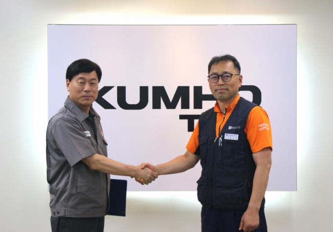 김명선 금호타이어 생산기술총괄 부사장(왼쪽)과 황용필 금호타이어지회 대표 지회장이 노사 특별합의 후 악수를 하고 있다. /사진제공=금호타이어 |