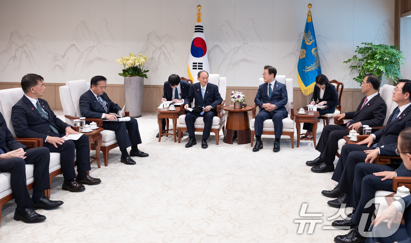 (서울=뉴스1) 이재명 기자 = 이재명 대통령이 30일 서울 용산 대통령실 청사에서 일한의원연맹 회장인 스가 요시히데 전 일본 총리를 접견하고 있다. (대통령실 제공. 재판매 및 DB금지) 2025.7.30/뉴스1