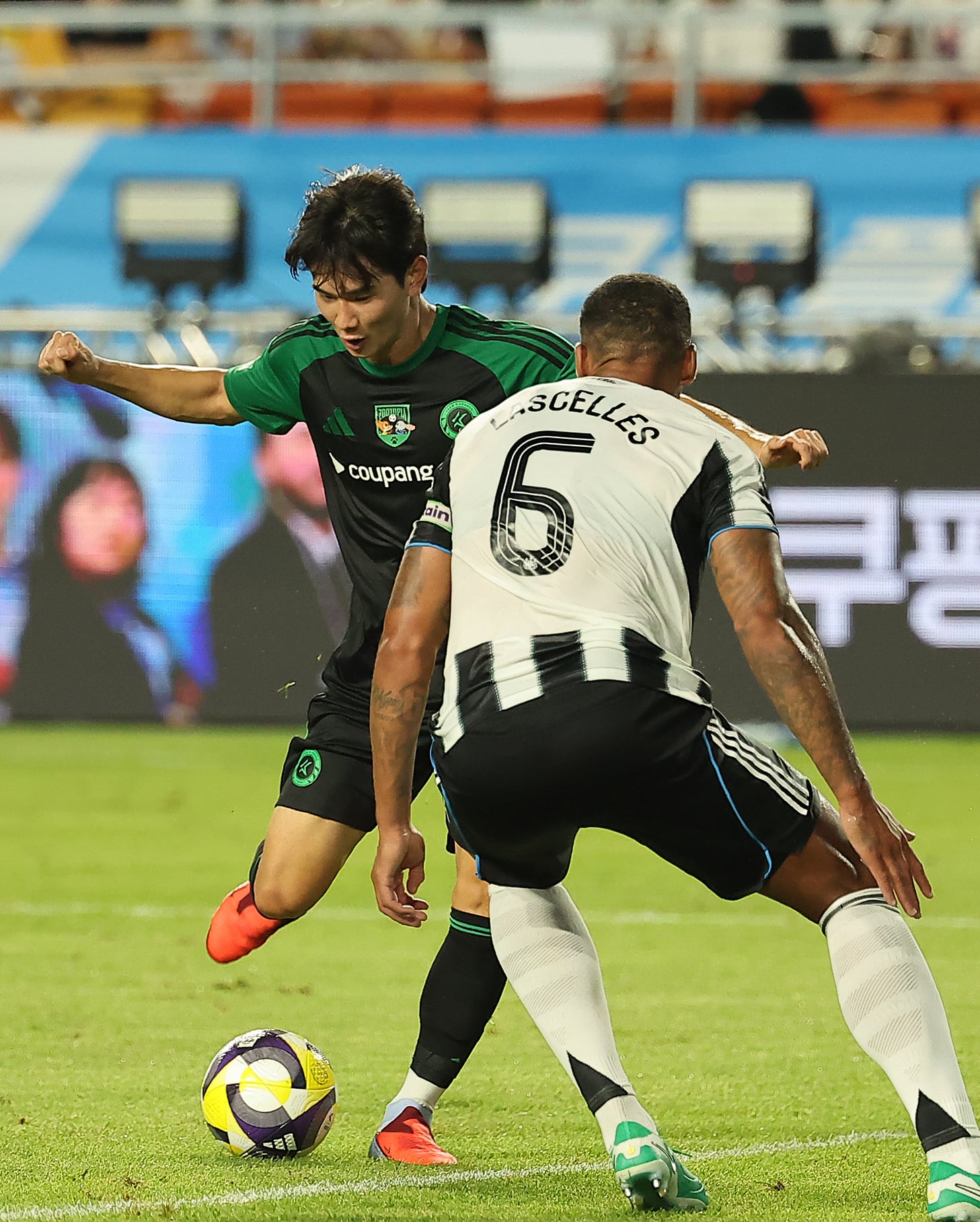 김판곤 울산 HD 감독이 이끈 팀 K리그는 이날 틀에 갇히지 않은 유연한 전술로 뉴캐슬을 공략했다. 뉴캐슬은 지난 시즌 주요 공격 활로였던 좌측의 티노 리브라멘토-앤서니 고든(이상 잉글랜드) 라인을 그대로 선발에 내세웠는데, 이에 맞서 우측 미드필더 이동경(김천)이 수비라인 깊숙이 내려와 집중 방어를 했다. 이동경의 대인 마크에 고든은 이날 전반전 슈팅 횟수가 1회에 그쳤다. 아울러 팀 K리그는 코너킥 등 세트피스 기회에서 체격이 좋은 상대 수비진과 직접 맞붙기보다 미드필더 쪽으로 공을 돌려 기습적인 중거리슛을 날리는 ‘우회 전략’을 썼다.