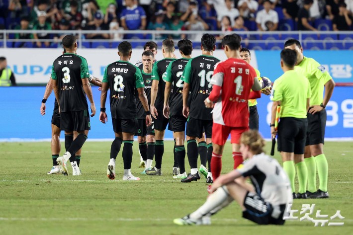 30일 수원월드컵경기장에서 열린 2025 쿠팡플레이 시리즈 팀 K리그와 뉴캐슬 유나이티드의 경기. 1대 0으로 승리한 팀K리그 선수들이 기뻐하고 있다.