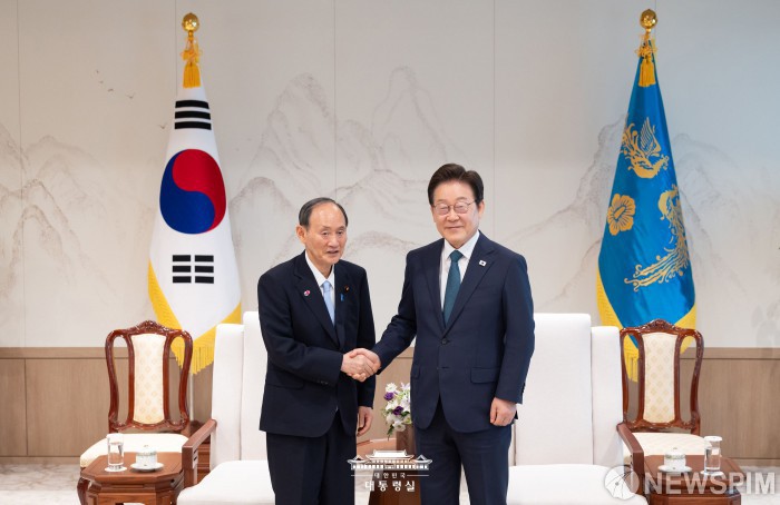 [서울=뉴스핌] 이재명 대통령이 30일 서울 용산 대통령실 청사에서 일한의원연맹 회장인 스가 요시히데 전 일본 총리를 접견하며 악수를 하고 있다. [사진=대통령실] 2025.07.30 photo@newspim.com