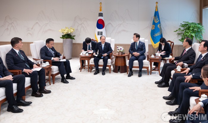 [서울=뉴스핌] 이재명 대통령이 30일 서울 용산 대통령실 청사에서 일한의원연맹 회장인 스가 요시히데 전 일본 총리를 접견하며 대화를 나누고 있다. [사진=대통령실] 2025.07.30 photo@newspim.com