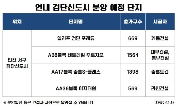 부동산정보업체 부동산인포에 따르면 검단신도시에서는 계룡건설(엘리프 검단 포레듀), 대우건설·동부건설(AB8블록), 중흥토건(AA17블록), 라인건설(AA36블록) 등 총 4곳에서 올해 4200가구가 분양될 계획이다.