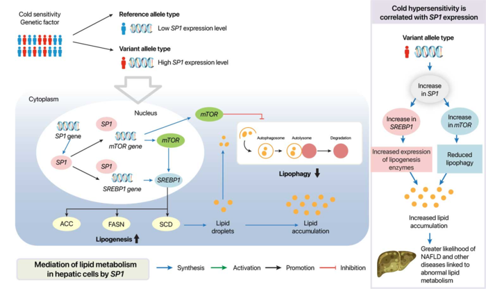 한증 연관 유전변이가 SP1 유전자 발현을 증가시켜 간세포 내 지방 생성 경로 활성도는 높아지고, 지방 포식 작용은 줄어 지방이 쌓일 가능성은 높아지는 것이다. 이는 비알코올성 지방간을 포함한 대사 질환 위험을 증가시킬 수 있는 생물학적 기반이 된다.