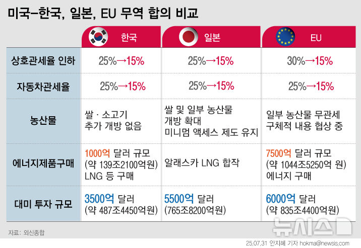 [서울=뉴시스]박미선 기자 = 8월1일 한미 상호관세 협상 시한을 앞두고, 한국이 도널드 트럼프 미국 대통령과 무역 합의를 타결했다. 미국이 한국에 대한 상호관세를 당초 25%에서 15%로 낮추는 대가로, 수백조 원 규모의 투자를 약속한 것이 골자다.