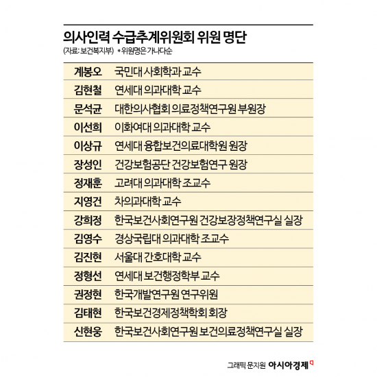 복지부는 수급추계위원회 구성을 위해 보건의료 공급자단체, 수요자단체, 학회·연구기관 등 21개 관련 단체·기관으로부터 다양한 전문가를 추천받았고, 이 가운데 전문성 등을 고려해 위원 15명을 위촉했다.