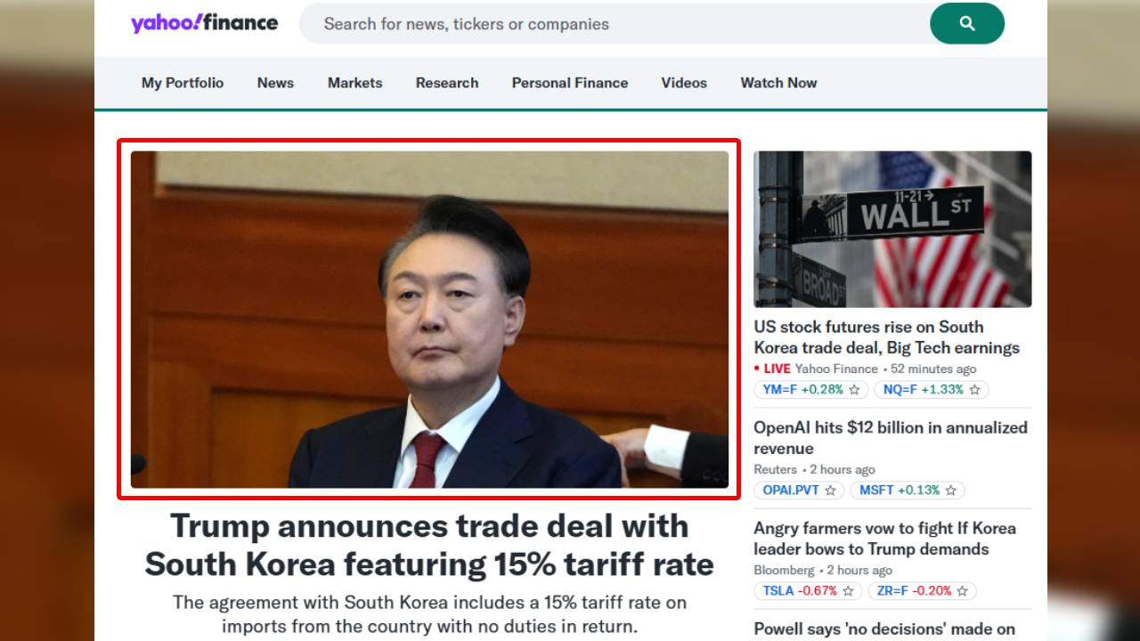 미국 경제 포털사이트 야후 파이낸스(Yahoo Finance)가 도널드 트럼프 미국 대통령의 한미 무역협정 발표를 보도하면서, 본문과 무관한 윤석열 전 대통령의 사진을 메인 톱 기사에 게시하는 일이 벌어졌다.