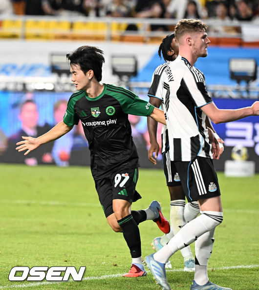[OSEN=수원, 지형준 기자] 30일 오후 수원월드컵경기장에서 2025 쿠팡플레이 시리즈 팀 K리그와 프리미어리그의 명문 클럽 뉴캐슬 유나이티드의 경기가 열렸다.뉴캐슬의 한국 방문은 창단 133년 만에 처음이다. 국내에서 뉴캐슬의 인지도는 상대적으로 낮은 편이지만, 최근 박승수의 영입으로 주목받고 있다. 뉴캐슬은 팀 K리그와 경기에 이어 8월 3일 서울월드컵경기장에서 토트넘 홋스퍼와 경기를 치른다.전반 팀 K리그 김진규가 선제골을 넣고 기뻐하고 있다. 2025.07.30 / jpnews@osen.co.kr |