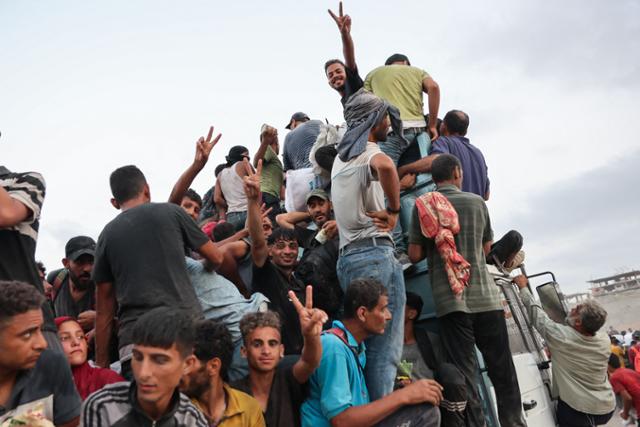 팔레스타인 가자지구 베이트라히야에서 지난 29일 주민들이 식량을 얻기 위해 구호품 트럭에 매달리고 있다. 베이트라히야=AFP 연합뉴스 |