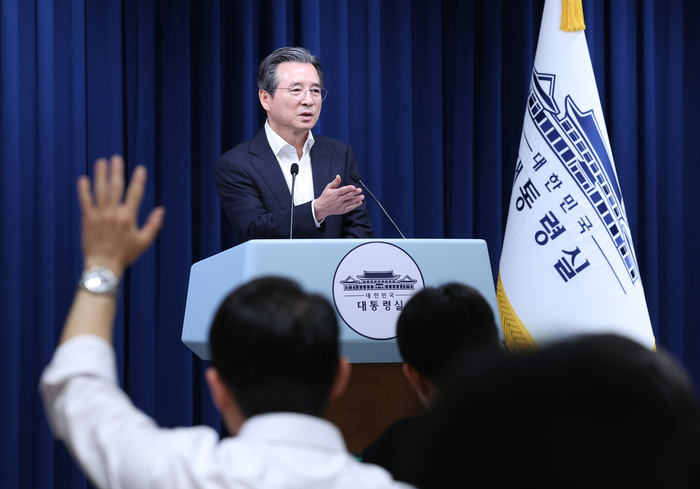 김용범 대통령실 정책실장이 31일 서울 용산 대통령실에서 대미 관세협상 관련 브리핑을 하고 있다. [김호영 기자] |