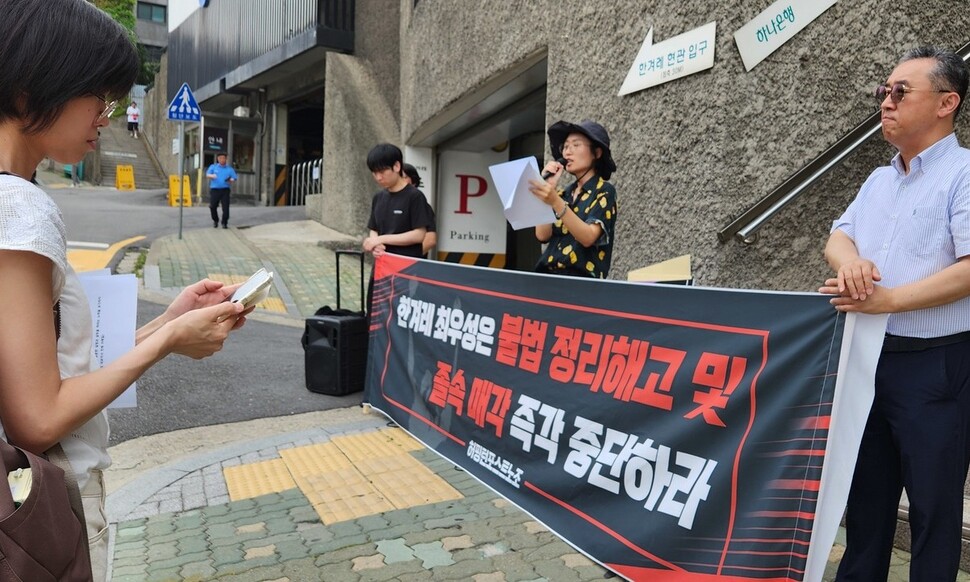 허핑턴포스트코리아노조(허프노조)는 31일 서울 마포구 한겨레신문 사옥 앞에서 기자회견을 열어 회사 매각 추진과 관련해 “실질적으로는 사업 양도에 해당하는데도 지분 매각으로 포장해 노조와의 교섭 의무를 회피하고 있다”며 매각을 중단하고 노조와 성실한 교섭에 나서라고 요구했다. 허프는 온라인 매체 ‘허프포스트’를 운영하는 직원 8명의 미디어 기업으로, 최근 사의를 밝힌 대표이사를 포함해 등기이사 3명 모두가 한겨레 전·현직 경영간부다. 한겨레는 자회사 허프 지분 100%를 비즈니스포스트에 매각하는 작업을 추진하고 있다.