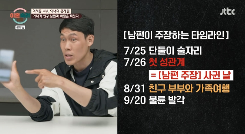 남편은 "(그쪽 부부와) 같이 술도 먹고 같이 놀러다니기도 했다. 우리 딸이랑 거기 아이도 친구다. 같은 어린이집도 다녔다. 그 친구는 둘째 임신 중이었다. 나는 다 봤다. 작년 9월 20일에 터졌을 때 봤다"고 말했다.