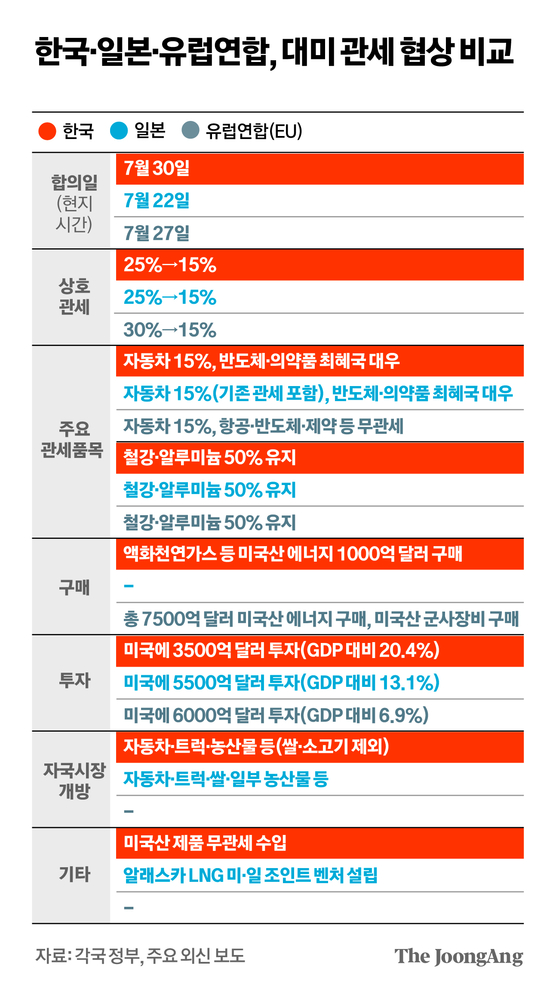 허윤 서강대 국제대학원 교수도 “협상을 더 끌어 상호관세가 부과됐다면 더 불리한 위치에서 협상을 할 수밖에 없었을 것”이라며 “대미 투자 등을 상당액 양보했지만, 선방한 것 같다”고 평가했다.