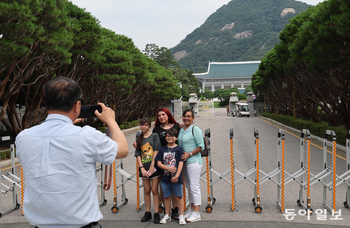 청와대 일반 관람 허용 마지막 날인 31일 외국인 관광객들이 서울 종로구에 있는 청와대 본관을 배경으로 기념사진을 찍고 있다. 이재명 대통령이 청와대를 집무 공간으로 다시 활용하기로 하면서 8월부터는 일반 관람이 중단된다.