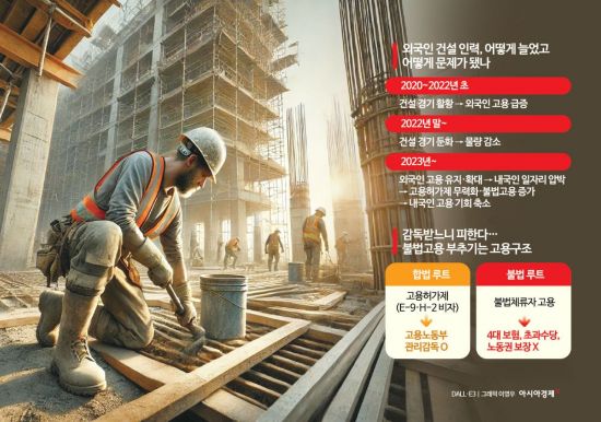 현장 근로자들은 건설업의 기형적 구조도 문제지만, 고용시장의 변화가 두렵다며 1일 이같이 토로했다. 외국인 근로자는 2020년부터 2022년 초까지 건설 경기가 활황이던 시기에 급증했다. 고령화와 3D 업종 기피로 건설 내국인 근로자가 줄어든 가운데 코로나 시기 저금리로 시중에 자금이 풀리면서 건설사들은 사업을 공격적으로 확대했다. 공사 현장은 빠르게 늘었지만 인력 공급은 따라가지 못했다. 45만원을 줘도 일손이 모자라 불법체류 외국인까지 서슴없이 투입하는 상황이 됐다.