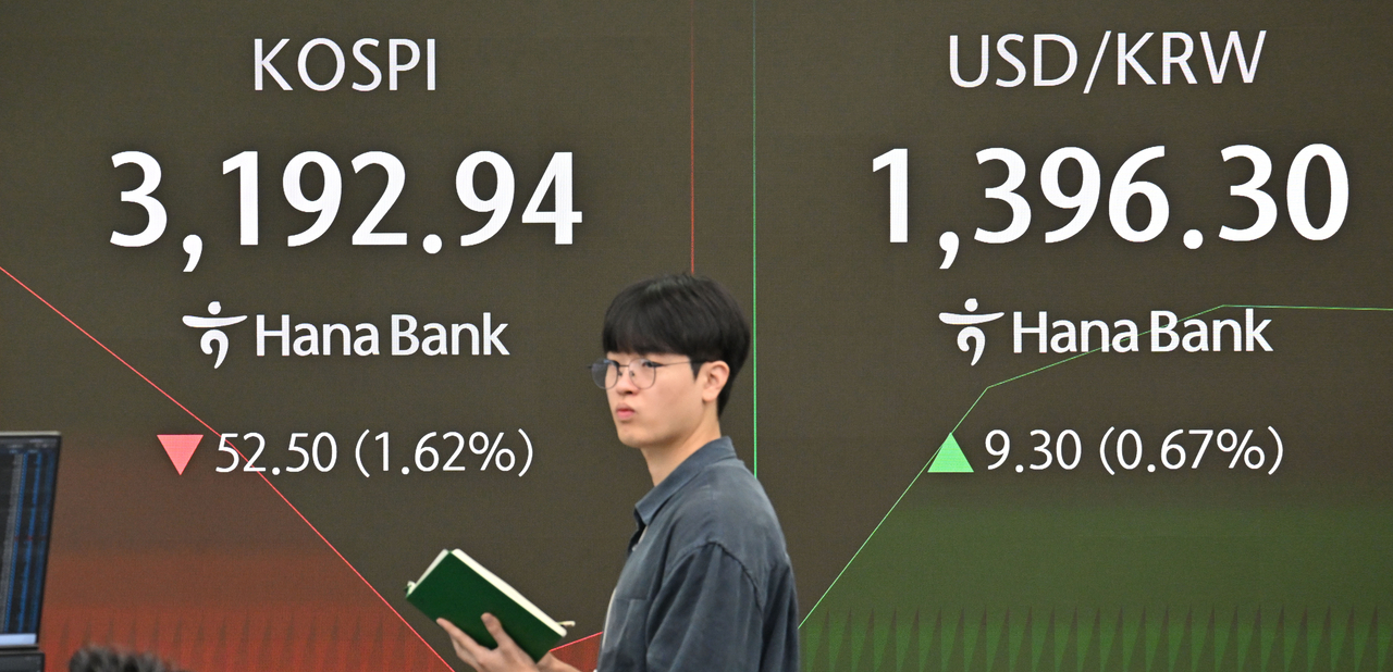1일 오전 서울 중구 하나은행 딜링룸 전광판에 코스피 지수가 오전 9시 4분 기준 전 거래일보다 52.50포인트 하락한 3192.94포인트를 나타내고 있다. 원·달러 환율은 1396.30원이다. 임세준 기자 |