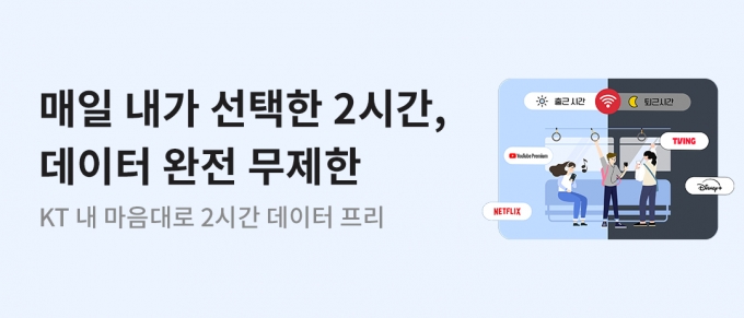 KT는 고객이 하루 중 원하는 2시간 데이터를 무제한 사용할 수 있는 맞춤형 서비스 '내 마음대로 2시간 데이터 프리'를 출시했다고 밝혔다.