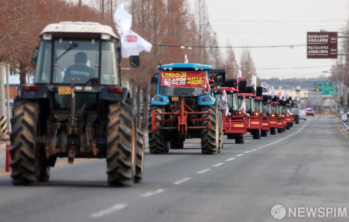 [무안=뉴스핌] 조은정 기자 = 25일 전국농민회총연맹(전농)이 트랙터 상경 시위를 예고했다. 사진은 지난해 12월 19일 오후 충남 천안시청 인근에서 트랙터와 트럭 수십대를 몰고 상경행진에 나선 전농 광주전남연맹이 윤석열 대통령 체포와 구속, 개방 농정 철폐 등을 촉구하며 서울로 향하는 모습. 2024.12.19 ej7648@newspim.com |