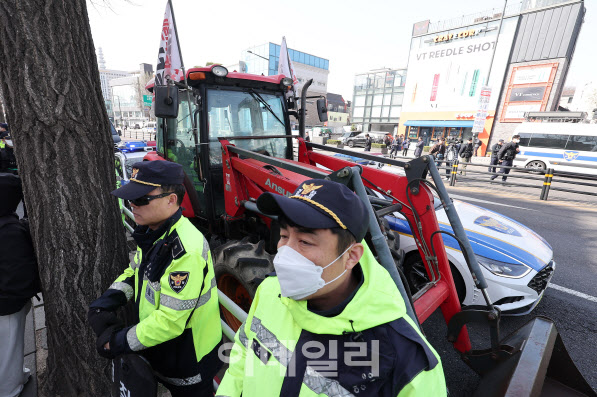 26일 오전 서울 종로구 자하문로 인근에서 경찰들이 전국농민회총연맹 소속 트랙터를 둘러싸고 있다.(사진=이데일리 DB) |