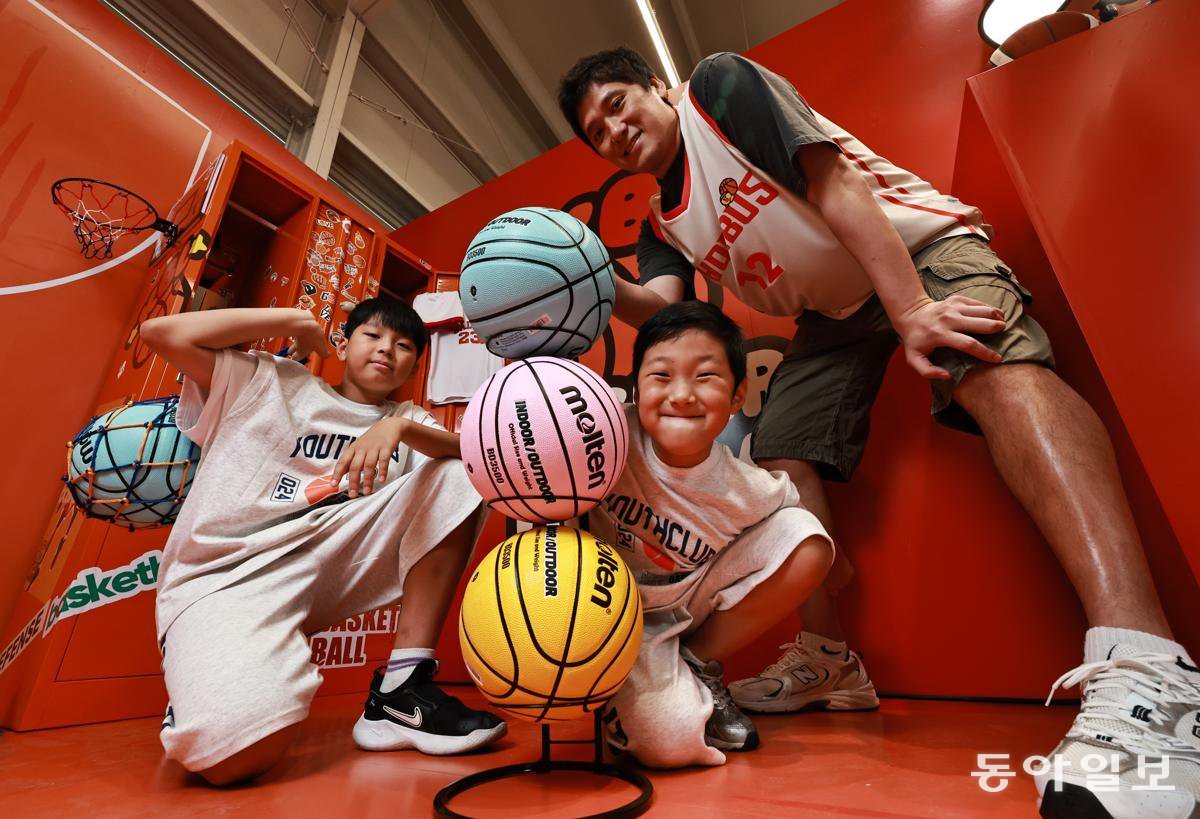 현대모비스의 함지훈(오른쪽)은 지난달 30일 서울 성동구 성수동에 마련된 한국프로농구(KBL) 팝업스토어를 두 아들 승후, 윤우(왼쪽부터)와 함께 찾아 1일 아르바이트를 했다. 양회성 기자 yohan@donga.com |