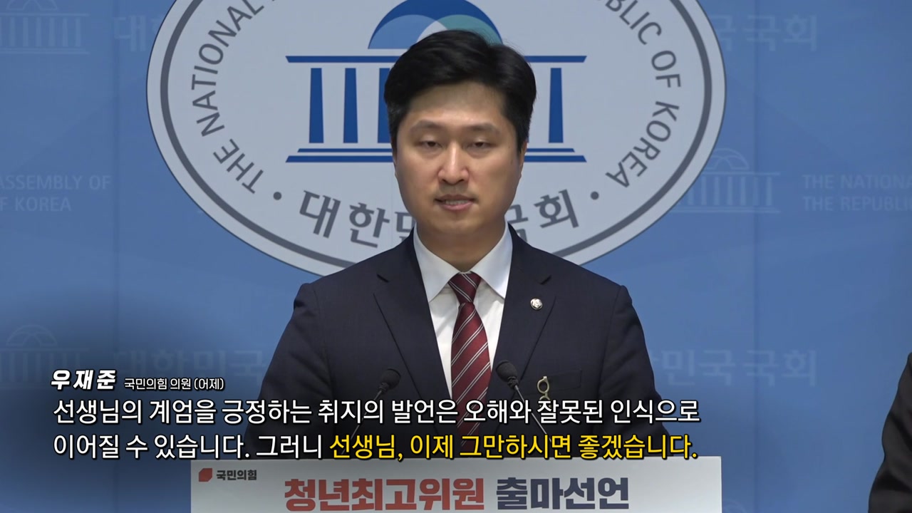 [우재준 / 국민의힘 의원 : 선생님의 계엄을 긍정하는 취지의 발언은 오해와 잘못된 인식으로 이어질 수 있습니다. 그러니 선생님, 이제 그만하시면 좋겠습니다. 제자들의 인생을 아끼던 모습으로 이제 그만 돌아가 주셨으면 좋겠습니다.
