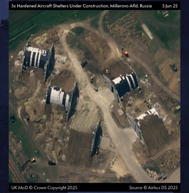 러시아가 밀레로보 비행장에 건설 중인 항공기 격납고 모습. 흙으로 덮는 공사가 진행 중인 것이 보인다. Planet via UK Ministry of Defense/X |