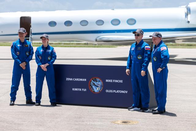 지난달 26일 일본 우주항공연구개발기구(JAXA)의 기미야 유이(왼쪽부터), 미 항공우주국(NASA·나사)의 제나 카드먼, 러시아연방우주공사(로스코스모스)의 올레그 플라토노프, 나사의 마이크 핀케가 미국 플로리다주 케네디 우주센터 발사 시설에 도착한 뒤 포즈를 취하고 있다. EPA 연합뉴스 |