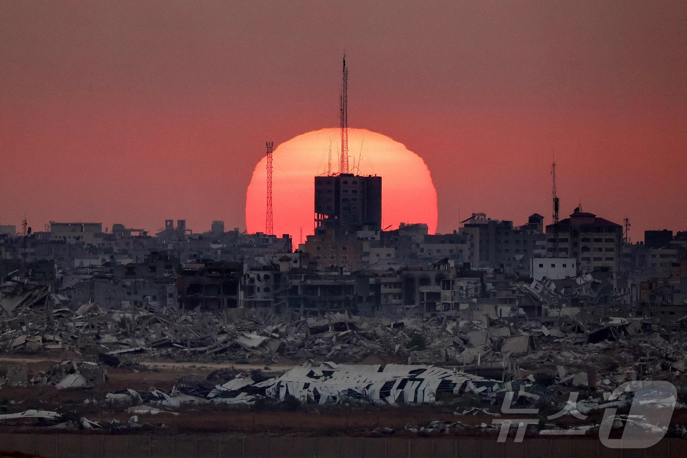 이스라엘 국경과 인접한 가자지구의 파괴된 건물 뒤로 태양이 지고 있는 모습. 2025.07.01 ⓒ AFP=뉴스1 ⓒ News1 김지완 기자 |