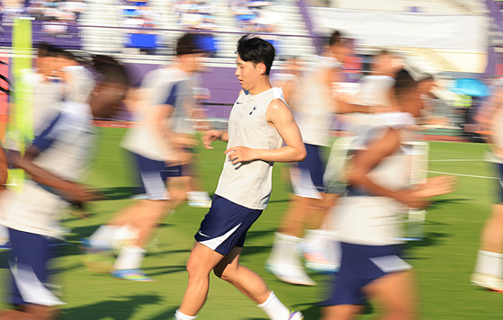 토트넘 유니폼을 입고 마지막 경기를 준비하는 손흥민(가운데). 연합뉴스 |