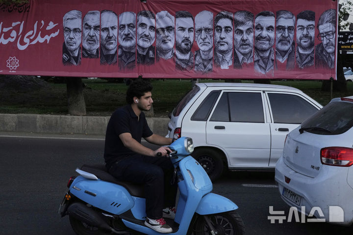 [테헤란=AP/뉴시스] 지난 6월30일 이란 테헤란 북부 타즈리시 광장에서 스쿠터와 차량이 이스라엘의 공습으로 사망한 이란군 지휘관들과 핵 과학자들의 초상이 담긴 현수막 옆을 지나가고 있다. 이란은 당시 모든 영공을 폐쇄, 공항 운항도 중지시켰다가 8월 2일 완전 재개방을 발표했다. 2025.08.03. |