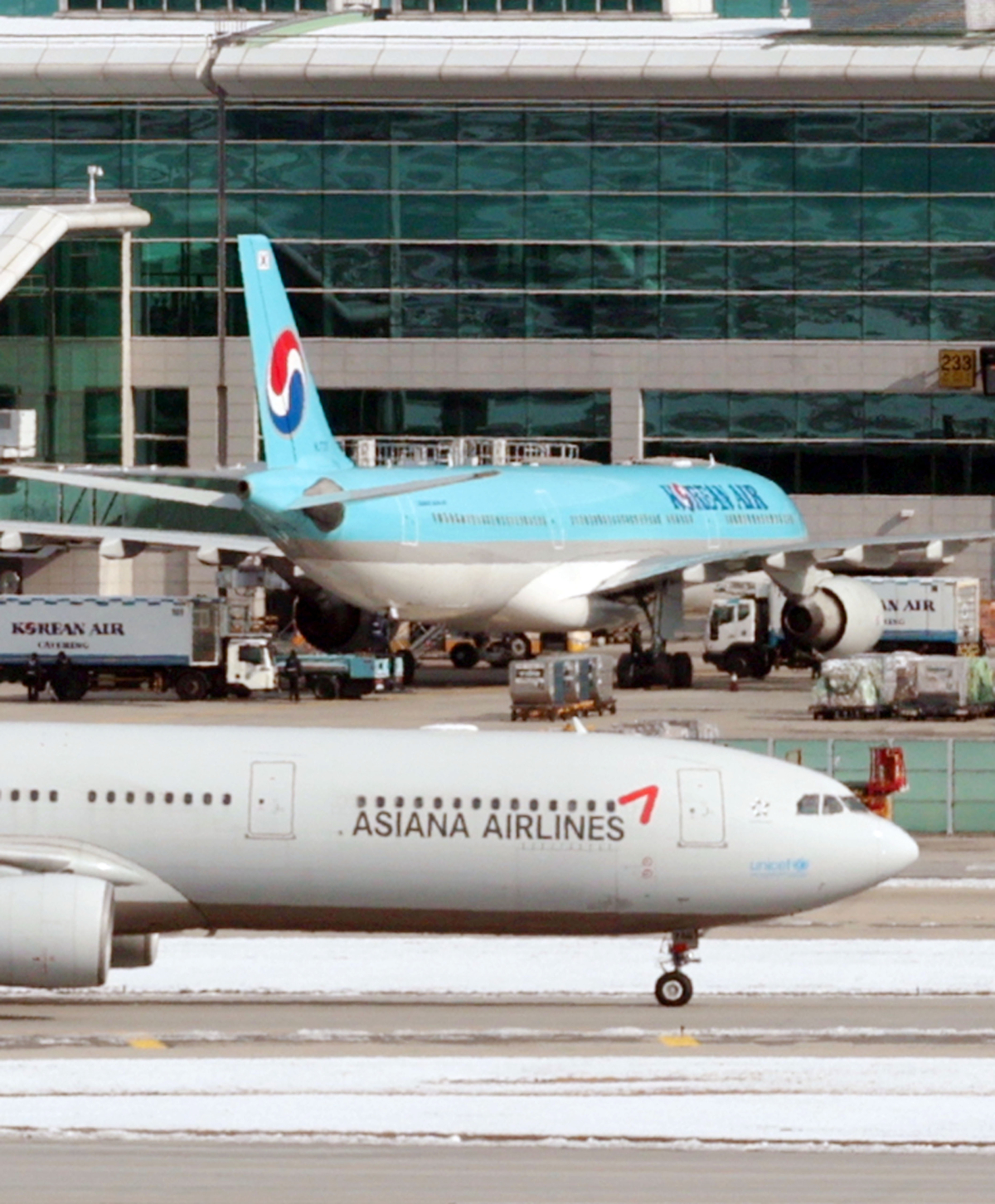 인천국제공항 활주로와 주기장에 대한항공-아시아나항공 여객기가 보이고 있다. |