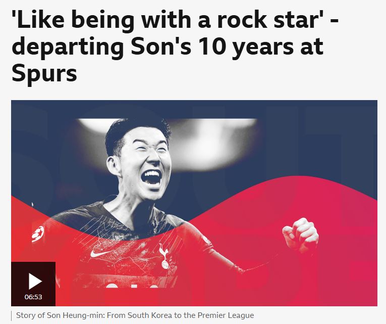 영국 'BBC'는 이날 홈페이지 메인 기사로 토트넘과 결별을 선언한 손흥민을 조명하는 특집 기사를 통해, 지난 10년간 그의 행보를 되짚고 이별의 아쉬움을 전했다.