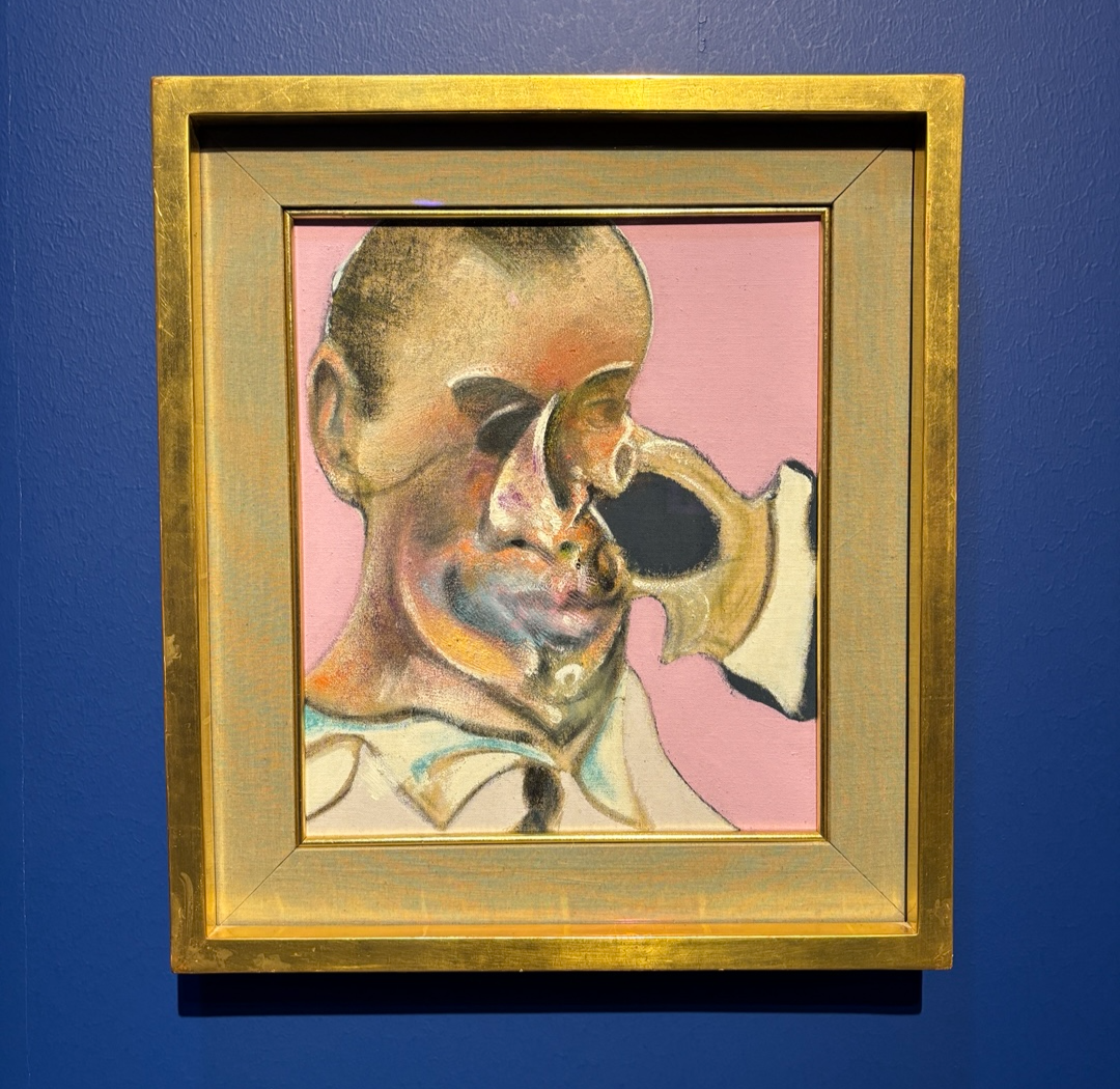 그림을 직접 보면 베이컨의 뛰어난 색채 감각이 그가 그리는 소재의 폭력성이 불러일으키는 거부감을 덜어주고 있음을 확인할 수 있다. 배경의 핑크와 어울리는 회색빛이 도는 검은색, 얼굴의 파스텔톤 보라색과 셔츠 깃에 칠한 파란색이 눈에 띈다. 베이컨은 아일랜드 더블린에서 태어나 1929년부터 실내 장식과 가구 디자인으로 돈을 벌기 시작해 런던 생활을 시작했다. 상업적으로 성공할 만큼 세련된 감각을 갖고 있었던 것이다.