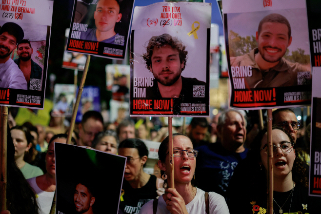 이스라엘 텔 아비브에서 시위대가 2023년 10월 7일부터 가자지구에 억류된 인질의 즉각적인 석방, 하마스의 이스라엘 공격과 전쟁 종식을 요구하는 시위에 참여하고 있다./로이터 연합 |