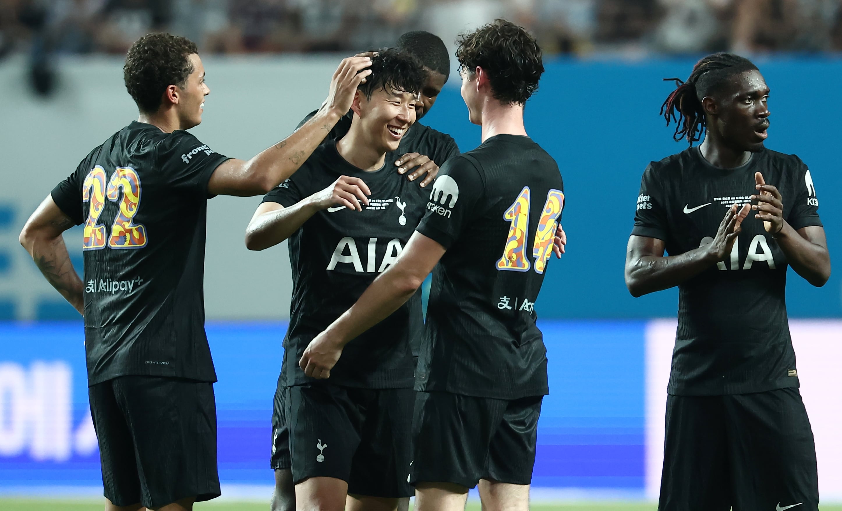 (서울=뉴스1) 김민지 기자 = 3일 오후 서울 마포구 서울월드컵경기장에서 열린 쿠팡플레이 시리즈 토트넘 홋스퍼와 뉴캐슬 유나이티드의 경기 후반전, 토트넘 손흥민이 교체되며 동료들의 격려를 받고 있다. 2025.8.3/뉴스1 |