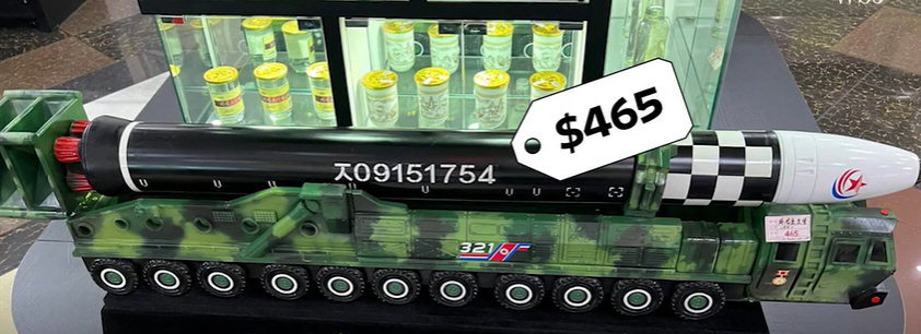 북한 원산갈마해안관광지구에서 판매하는 대륙간탄도미사일(ICBM) ‘화성-17형’ 모형 기념품. WSJ 영상 캡처 |