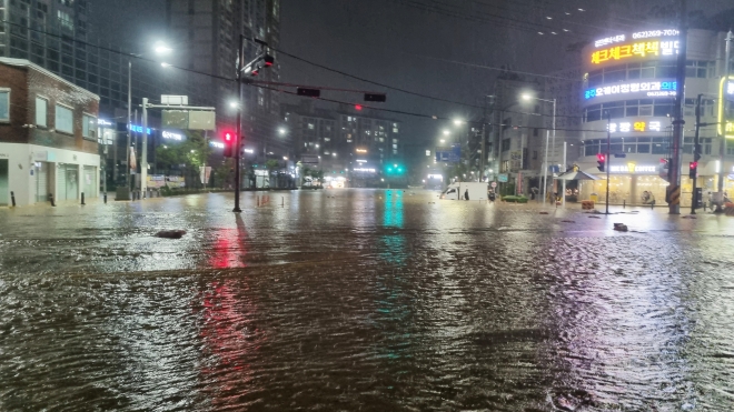 호우경보가 내린 3일 오후 광주 북구 운암동 일대 도로가 침수돼 성인 무릎까지 잠겨있다. 2025.8.3 광주 북구 제공 |