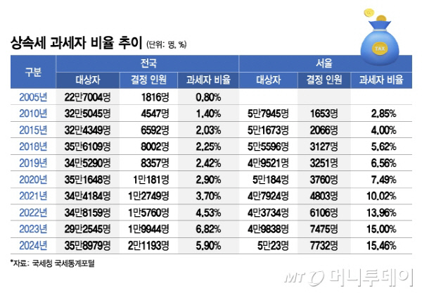 실제 국세청 국세통계포털 상속세 결정 현황에 따르면 지난해 피상속인(과세자+과세 미달자) 35만8979명 중에서 상속세 과세 대상자는 2만1193명이다. 2020년(1만181명) 이후 4년 만에 2.08배 수준이다. 상속세 과세 대상자가 2만명을 돌파한 건 지난해가 처음이다. 도입 당시 '1% 부자'를 겨냥한 세금이었던 상속세가 '중산층 세금'이 됐단 푸념이 나오는 배경이다.