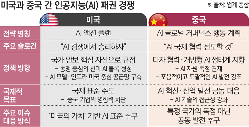 중국도 ‘AI 행동계획’을 선언하며 맞불을 놨다. 사우스차이나모닝포스트 등 매체에 따르면 중국은 지난달 26일부터 3일간 상하이에서 ‘세계인공지능대회(WAIC)’를 열었다. 이 자리에서 리창 중국 총리는 “중국은 국제협력을 이끌 글로벌 AI 협력기구 설립을 전격 제안한다”며 ”현재 AI 핵심 자원과 역량은 소수의 몇 개 국가, 소수의 몇 개 기업에 집중돼 있다”고 말했다.