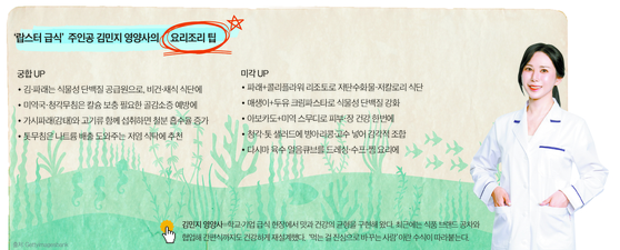 해조류가 미역국, 도시락 김으로만 반복되는 식탁은 좀 아쉽다. 김민지 영양사는 “익숙한 방식만으로는 해조류 섭취의 지속성·효율성이 떨어진다”며 “해조류는 매일 식단에 넣을 수 있을 만큼 응용의 폭이 넓다. 창의적으로 조리하면 색다른 식감과 맛을 낸다”고 말했다.